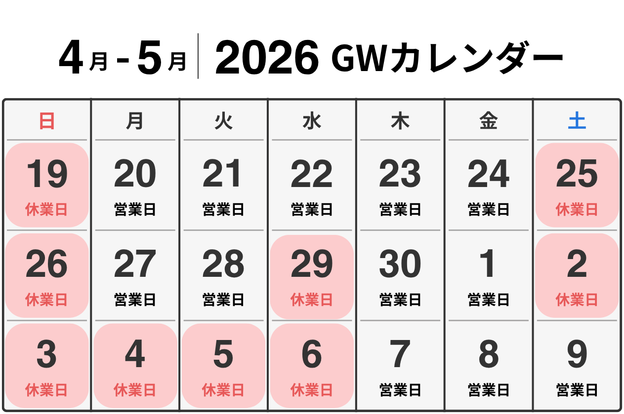 誠に勝手でございますが、弊社ではゴールデンウィークにあたり、下記の期間を休業とさせていただきます。